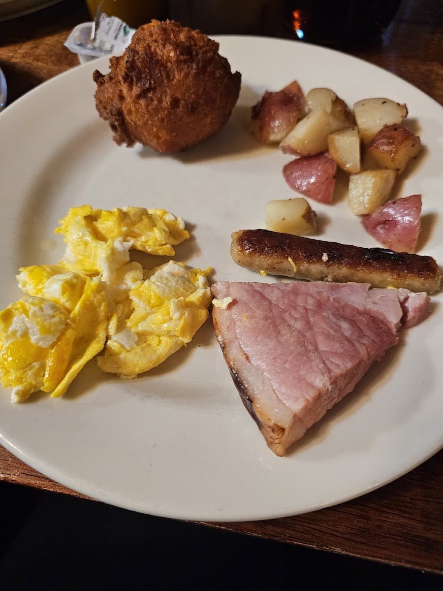 Excellent breakfast! No menu, everything comes out family style. It's also all you can eat, so you have no excuse leaving hungry! Home fries were exceptional! Pancakes are very good, they are not made with sugars or vanilla. So if you like an older style whole wheat type pancake, this is the place to get them. We are looking forward to coming back on a Friday afternoon for dinner.