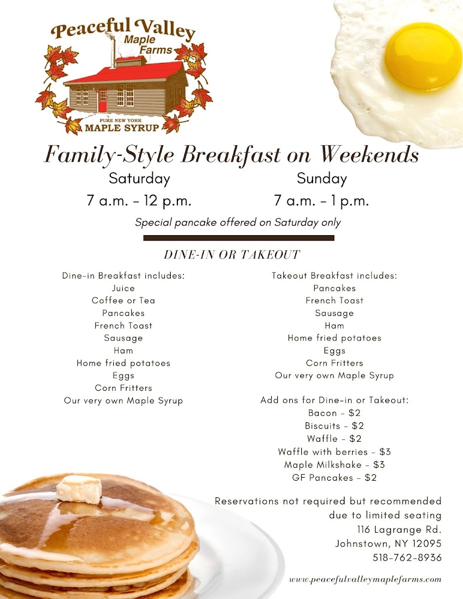 The menu at Peaceful Valley Maple Farms offers a comforting selection of breakfast dishes crafted with a family-style approach. Expect simple, hearty plates that pair naturally with the farm’s signature maple syrup, making each bite both familiar and satisfying. Whether you’re stopping by for a leisurely weekend morning or a casual weekday start, the menu encourages a relaxed pace and shared moments around the table.